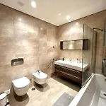 Há controle de temperatura para um conforto óptimo, bem como TV de tela plana com canais via satélite.